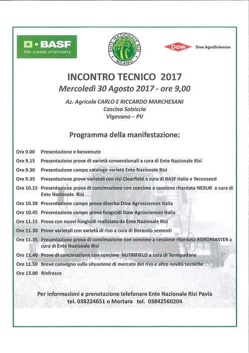 Mercoledì 30 Agosto 2017 alle ore 9.00 si svolgerà l’incontro tecnico alla Cascina Salsiccia. Al consueto appuntamento presso l’Azienda Agricola di Carlo e Riccardo Marchesani di Vigevano (PV), si parlerà delle nuove varietà di Ente Risi e si presenteranno le prove varietali con tecnologia Clearfield a cura di BASF Italia e di Tecnoseed. Verranno presentate anche prove di concimazione a cura di Ente Nazionale Risi e Terrepadane, oltre ad alcune prove di diserbi e fungicidi di Dow Agrosciences Italia. Ci sarà spazio anche per la presentazione di prove varietali della ditta Borando Sementi. Seguirà un breve convegno sulla situazione di mercato e sulle novità della stagione 2017/2018. Alle ore 13.00 si terminerà con il rinfresco.