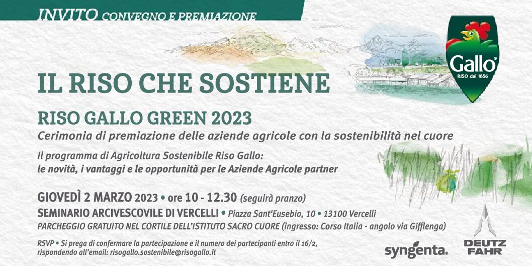 Riso Gallo Green 2023 Cerimonia di premiazione delle aziende agricole con la sostenibilità nel cuore. Tutte le novità, i vantaggi e le opportunità riservate alle aziende agricole partner della filiera di Sostenibilità Riso Gallo. L'incontro si svolgerà Giovedì 2 Marzo 2023 dalle ore 10 alle 12.30 presso il Seminario Arcivescovile di Vercelli in Piazza Sant'Eusebio.